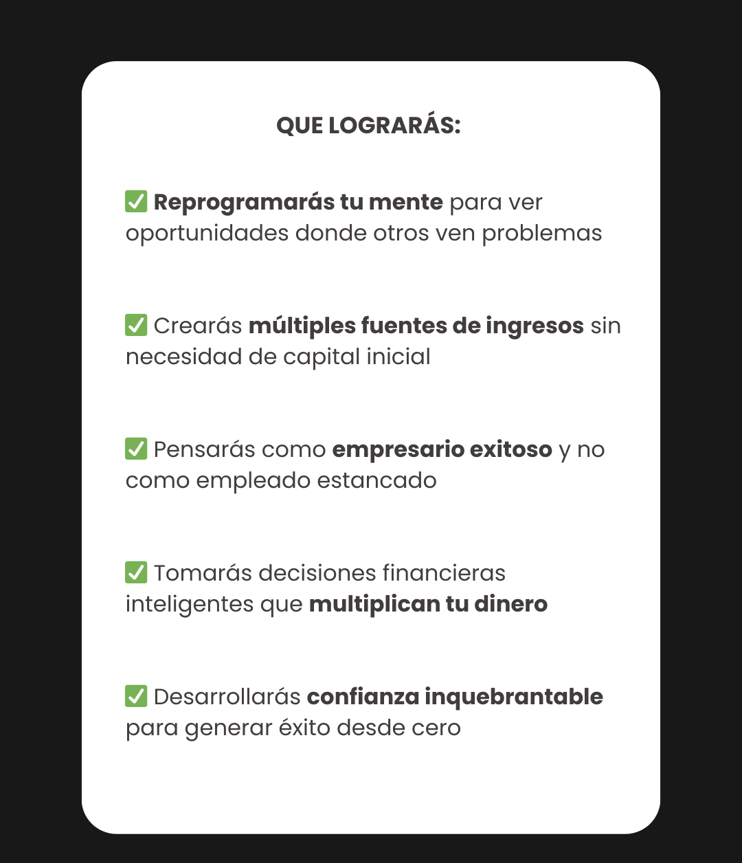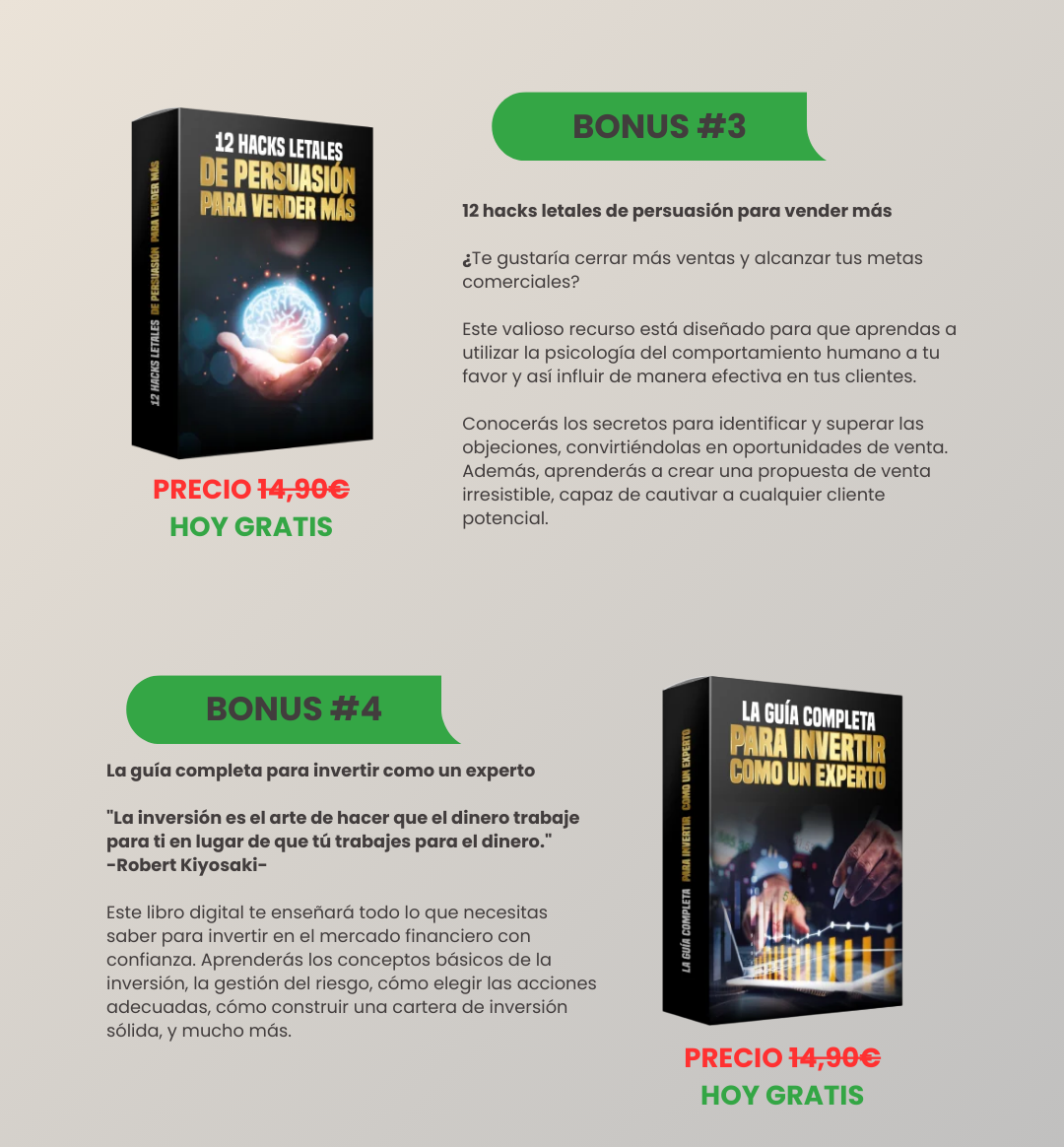 No. Las estrategias de mentalidad y los métodos que aprenderás no requieren inversión de capital. Puedes comenzar a implementarlos inmediatamente sin gastar un peso adicional.